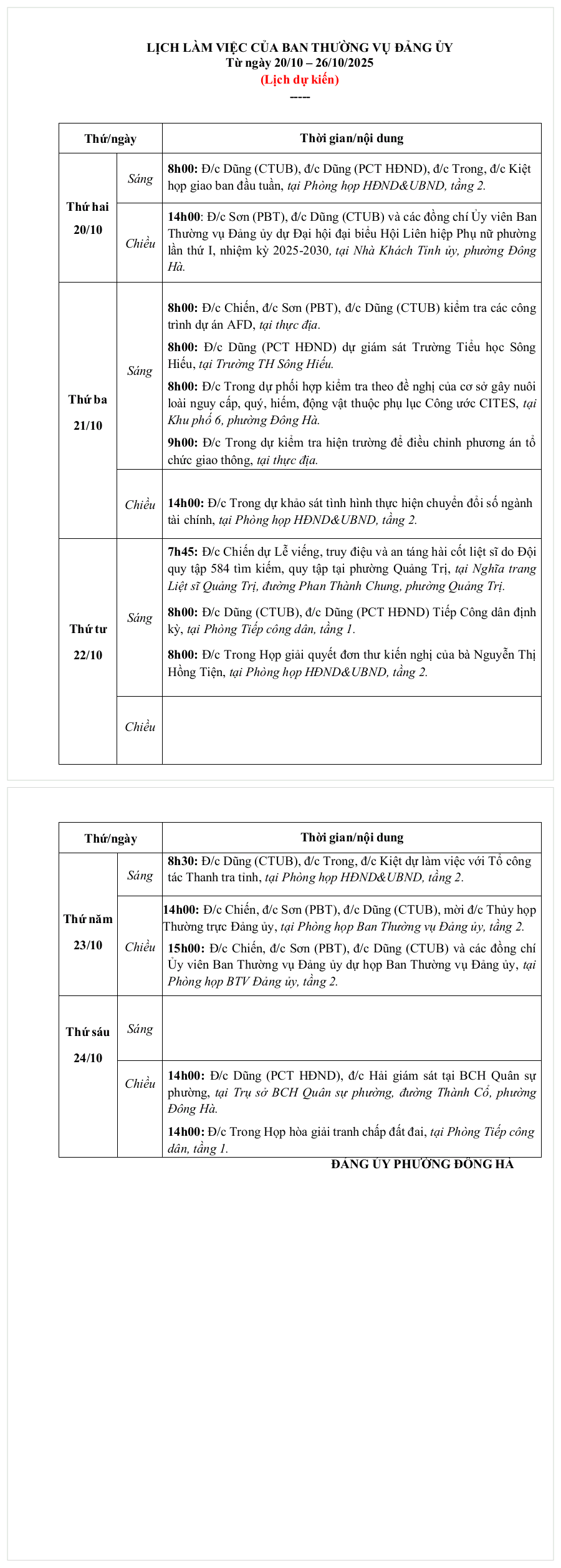 Lịch làm việc Ban Thường vụ Đảng ủy phường Đông Hà (từ ngày 20/10/2025 đến 26/10/2025)