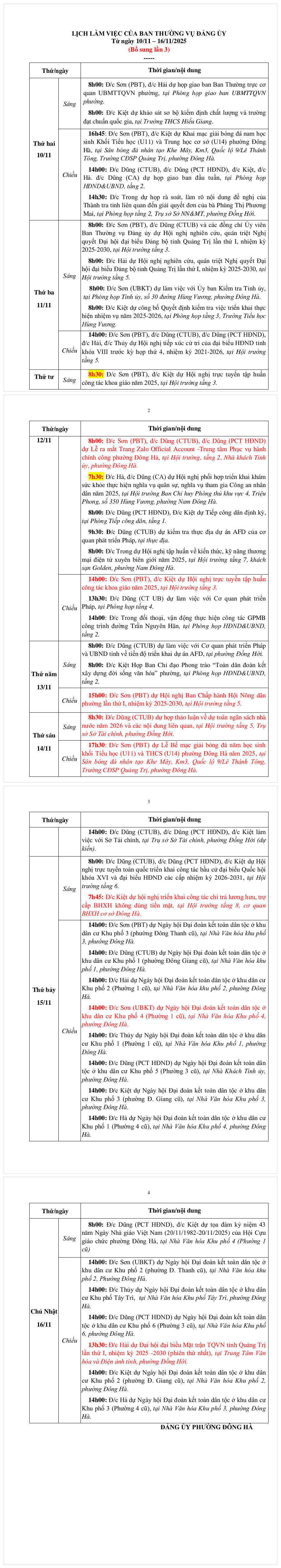 Lịch làm việc Ban Thường vụ Đảng ủy phường Đông Hà (bổ sung lần 3)(từ ngày 10/11/2025 đến 16/11/2025)
