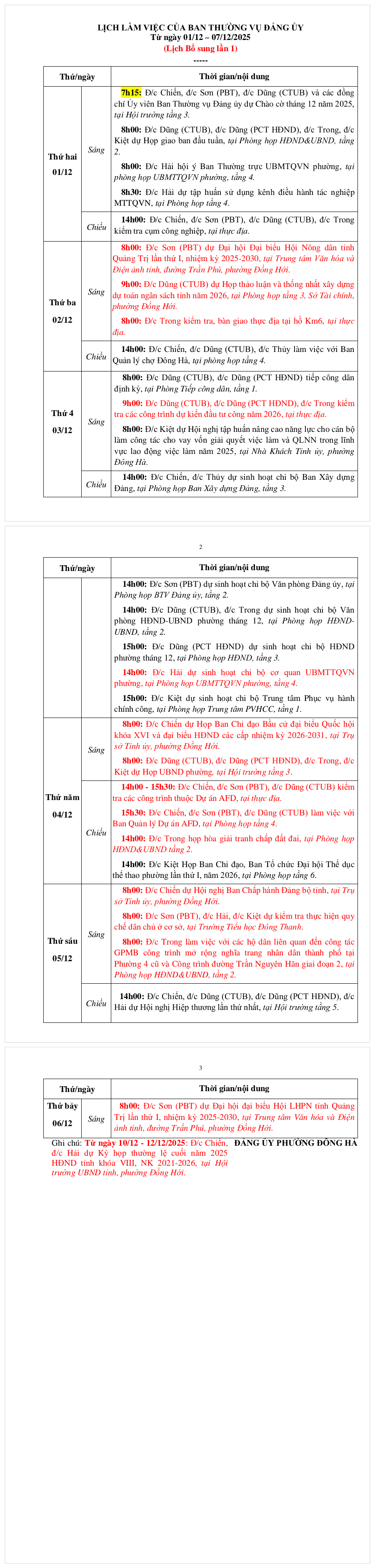 Lịch làm việc Ban Thường vụ Đảng ủy phường Đông Hà (bổ sung lần 1) (từ ngày 01/12/2025 đến 05/12/2025)